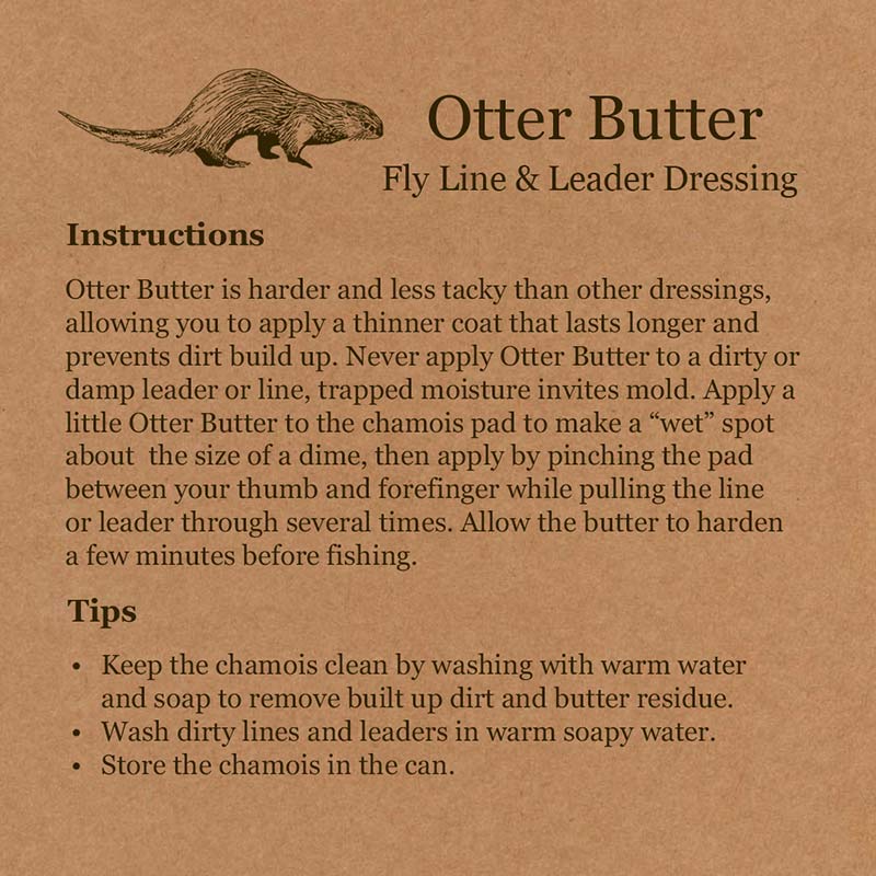 Otter Butter is a hand-crafted fly line and leader dressing made in Groton, MA. Otter Butter applies easily with the included chamois applicator and a single application should last through a long day on the water. Originally developed for oiled silk fly lines, Otter Butter can be used on silk lines, furled leaders and tenkara lines and even modern synthetic fly lines. It does not contain any harmful solvents or ingredients and does not contain silicones. Otter Butter has a mild and pleasant beeswax fragrance. Otter Butter leaves a thin, hard coating on your line that glides through the guides. You will hear and feel the difference on silk and modern synthetic lines. It also does not pick up grit like other line dressings.